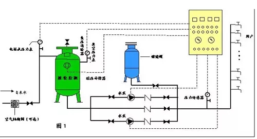 二次供水設(shè)備由氣壓罐、水泵及電控系統(tǒng)三部分組成,其突出優(yōu)點(diǎn)是,不需建造水塔,投資小、占地少,布置靈活,建成投產(chǎn)快。采用水氣自動(dòng)調(diào)節(jié)、自動(dòng)運(yùn)轉(zhuǎn)、節(jié)能與自來(lái)水自動(dòng)并網(wǎng),停電后仍可供水,調(diào)試后不需看管。