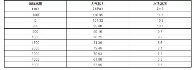 不同海拔時(shí)的大氣及對(duì)應(yīng)的水頭高度見(jiàn)下表: