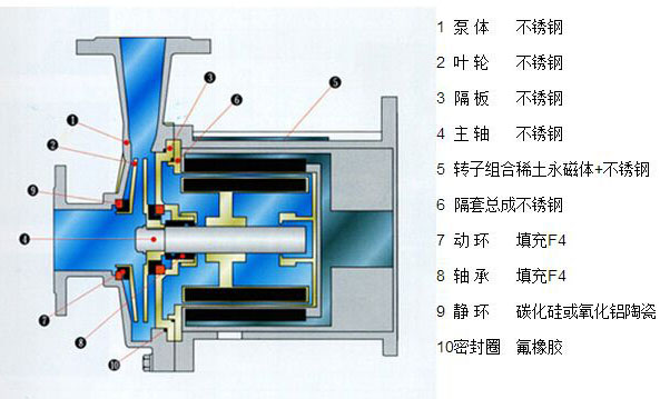 1一泵殼;2一葉輪;3一隔板;4-隔離套;5—外磁轉(zhuǎn)子;6一內(nèi)磁轉(zhuǎn)子;7一泵軸