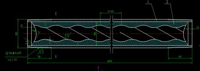 2.定子的截面圖形確定后,大徑通過(guò)計(jì)算得出為42mm,前面提到過(guò)定子多種外徑型號(hào),我們?cè)谶@選擇接近大徑的外徑尺寸為73mm,因?yàn)橹兰?jí)數(shù),那么我們就可得出定子的總長(zhǎng)為L(zhǎng)=導(dǎo)程*級(jí)數(shù)=110*42=4620mm,一般我們?cè)诶碚撻L(zhǎng)度上在 加上50mm,預(yù)留一些作為加工余量或者工藝尺寸,在這里我們就確定定子的總長(zhǎng)為4670mm。如下所示: