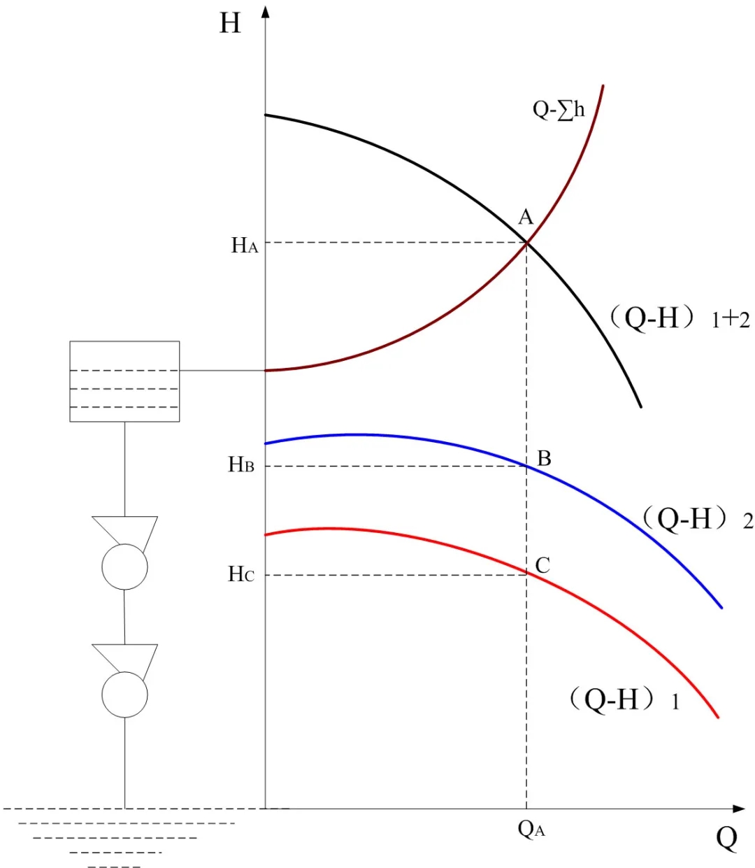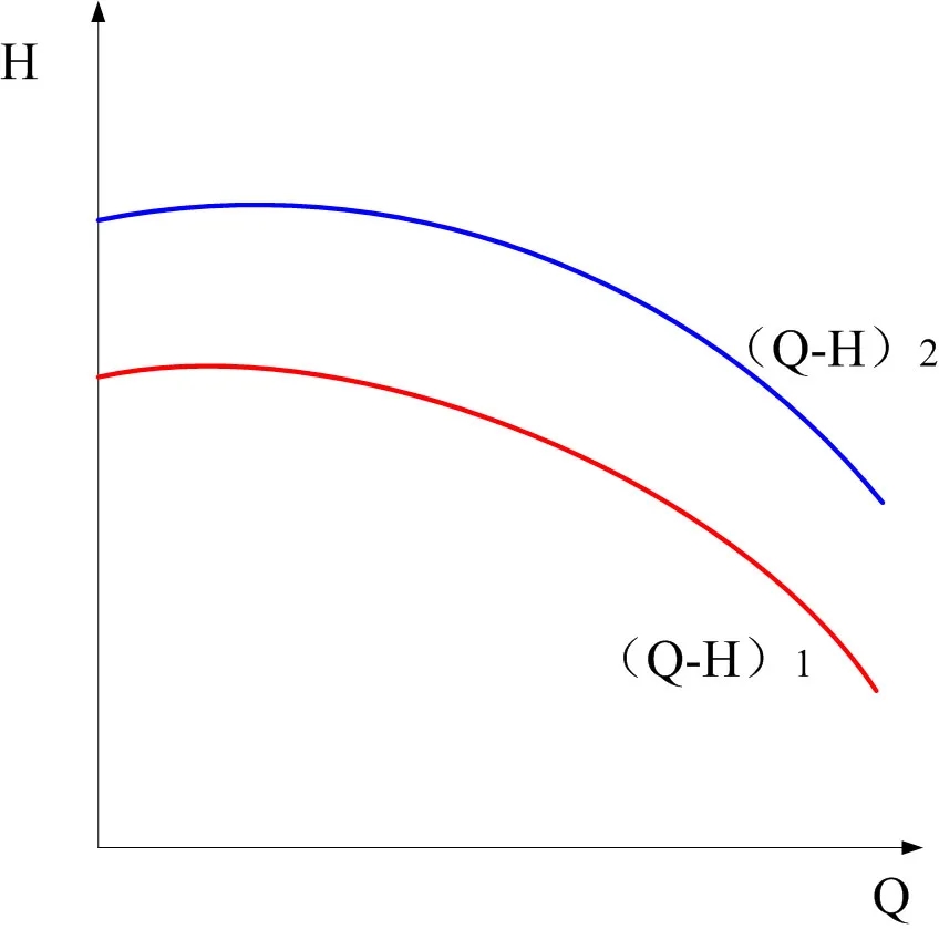 先畫出兩臺(tái)排污泵B和C的流量-揚(yáng)程曲線(Q-H)2,和(Q-H)1