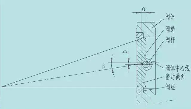 閥板回轉(zhuǎn)中心(即閥門軸中心)于閥板密封截面形成一個A偏置,并與閥體中心形成一個b偏置;閥體密封面中心線與閥座中心線(即閥體中心線)形成一個角度為β的角偏置。