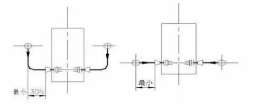 雙吸入泵的吸入口應(yīng)設(shè)一段不小于3倍機(jī)泵入口管徑長(zhǎng)的直管段,大型泵應(yīng)有7倍機(jī)泵入口管徑以上的直管段,以使液體平穩(wěn)入泵,避免產(chǎn)生偏流和旋轉(zhuǎn)流,引起泵振動(dòng)和產(chǎn)生噪音。