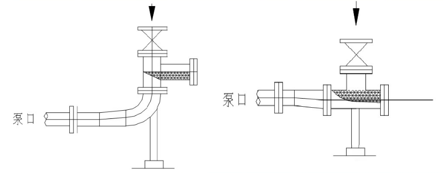 當(dāng)泵的吸入口和排出口在同一個(gè)垂直面上時(shí),為便于安裝閥門,進(jìn)出口可用偏心異徑管或兩個(gè)45°彎頭增大進(jìn)出口管間距: