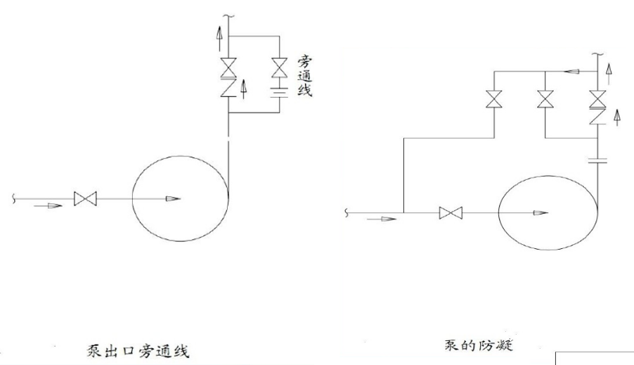 泵的保護(hù)管線——旁通線:啟動(dòng)高揚(yáng)程泵時(shí),出口閥單方面受壓過(guò)大,不易打開,若強(qiáng)制開啟,將有損壞閥桿、閥座的危險(xiǎn)。在出口閥前后設(shè)置帶有限流孔板的旁通線,便可容易開啟。同時(shí),旁通線還有減少管線振動(dòng)和噪聲的作用。