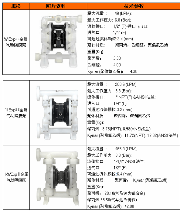 已被廣泛地應(yīng)用,因?yàn)樗旧砭邆淞撕芏鄠鹘y(tǒng)電泵所不能代替的優(yōu)點(diǎn),如:氣動的設(shè)備非常安全討于一些易燃易爆的化工物料沒有后顧之憂;耐腐蝕和防滲漏,因?yàn)榇吮脹]有軸動密封圈沒有滲漏的可能;任意的無級變速,在輸出端可做流量的任意調(diào)整而不用附加裝置,此泵有空載或超負(fù)荷的發(fā)熱燒泵;沒有齒輪和葉輪,能夠輸送沙水混合物;是靠特殊膜片的收縮擠壓而將流體吸入或輸岀,對化工方面的粘稠狀物料非常適合等。ARO泵具備獨(dú)一無二的專利氣閥,絕無死點(diǎn),排氣口不結(jié)冰,比其它氣泵流量更大。