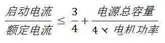 直接啟動電流很大,因此一般用于功率小于15KW的電機或者在供電、動力部門允許的情況下放寬電機功率范圍。是否能直接啟動主要取決于電機功率與變壓器容量之比。在有獨立變壓器,電機欲頻繁啟動,電動機的功率一般要小于變壓器容量的20%。如果不用頻繁啟動,該值可為30%。如果直接接入電力公司電網(wǎng),沒有獨立變壓器,按如下公式進行估算: