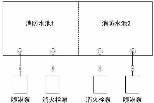 方案四(不應):本方案存在較大隱患,當一格(或一座)消防水池檢修時,泵組不再具備一用一備的功能。