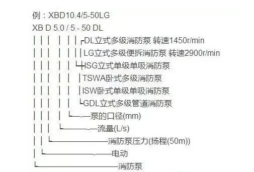 2、消防泵組型號由泵特征、泵組特征代號、主參數(shù)、用途特征代號、輔助特征代號及企業(yè)自定義代號等六個部分組成。其組成形式如下: