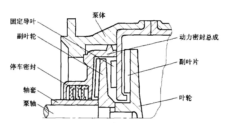 動(dòng)力密封可分為背葉片密封和副葉輪密封兩類。泵工作時(shí)靠背葉片(或副葉輪)的離心力作用使軸封處的介質(zhì)壓力下降至常壓或負(fù)壓狀態(tài),使泵在使用過(guò)程中不泄漏。停車時(shí)離心力消失,背葉片(或副葉輪)的密封作用失效,這時(shí)靠停車密封裝置起到密封作用。