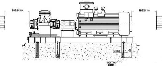 (2)一般功率在100kw以下時,水泵和電動機(jī)帶有底盤,可直接安裝在基礎(chǔ)上;100kw以上時,無底盤,基礎(chǔ)面需墊以鋼板或型鋼。