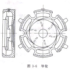 分段式多級(jí)離心泵工作原理:分段式多級(jí)離心泵中段每個(gè)葉輪的外面均安裝有一個(gè)導(dǎo)輪,導(dǎo)輪是一個(gè)固定不動(dòng)的圓盤(pán),它的作用是把從葉輪甩出的液體的一部分動(dòng)能通過(guò)減速而轉(zhuǎn)化為靜壓能,并且把這些液體收集后沿徑向回流而導(dǎo)人到下一級(jí)葉輪人口處。尋輪的正面有環(huán)繞在葉輪外緣的正向?qū)~.背面有將液體引向下一級(jí)葉輪人口的反向?qū)~,其結(jié)構(gòu)如圖6所示。