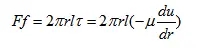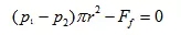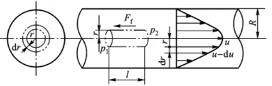 如上圖所示,液體在直徑d的圓管中作層流運(yùn)動(dòng),圓管水平放置,在管內(nèi)取一段與管軸線(xiàn)重合的小圓柱體,設(shè)其半徑為r,長(zhǎng)度為l。在這一小圓柱體上沿管軸方向的作用力有:左端壓力p1,右端壓力p2,圓柱面上的摩擦力為Ff。則其受力平衡方程式為: