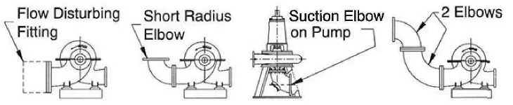 距離泵(入口法蘭至少)5倍吸入管徑內(nèi)不應(yīng)有干擾流量的配件(如部分打開的閥門、三通、短半徑彎頭等),完全打開的、無流量干擾的閥門、葉片式彎頭、長半徑彎頭和異徑管不被視為流量干擾配件(參見圖2和圖3)。