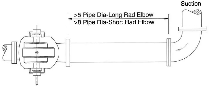 2)當(dāng)配管為端吸或側(cè)面吸入時,吸入口推薦的最小直管段長度為入口直徑的3倍,并且直管段不包含過渡段長度。對于大型雙吸入泵應(yīng)有更大倍數(shù)管徑的直管段,如5倍~7倍。
