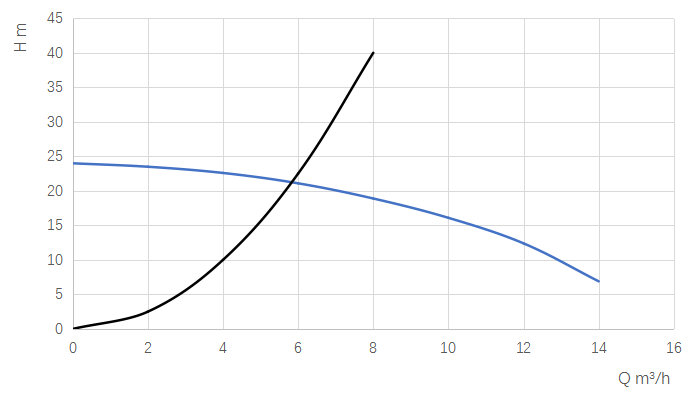 回到我們的正題,當(dāng)水泵性能曲線和系統(tǒng)阻力曲線繪制在一個(gè)圖表內(nèi)時(shí),它們的交點(diǎn)即為水泵的實(shí)際工作點(diǎn):