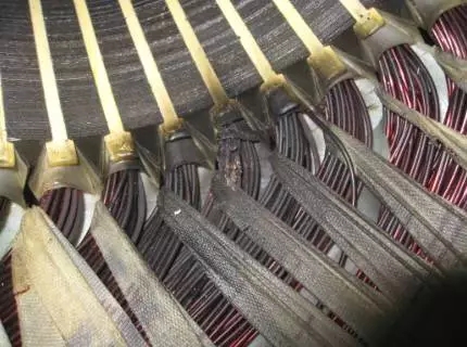 繞組全部變黑色,端部扎帶變色并且變脆甚至斷裂。