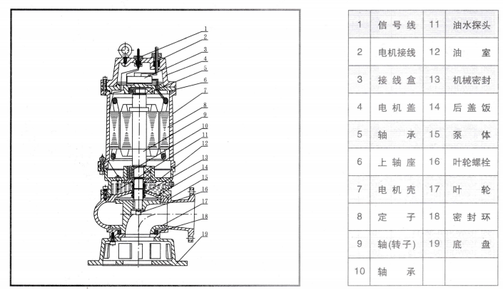 漏水探頭11:該元件裝在油室內(nèi),當(dāng)機(jī)械密封損壞后,水進(jìn)入油室,探頭可發(fā)出信號(hào)由控制系統(tǒng)對(duì)泵實(shí)施保護(hù)。