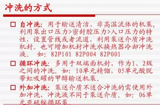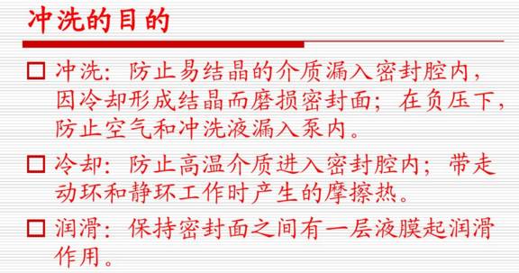 沖洗裝置是機械密封最主要的輔助設施,泵在運轉(zhuǎn)過程中,密封腔中沉積或形成雜質(zhì),必須進行沖洗。否則會因結(jié)晶的析出、顆粒雜質(zhì)的沉淀,使機械密封動、靜環(huán)失去浮動性,彈簧失靈。更嚴重的是顆粒磨損、雜質(zhì)進入摩擦副會加劇磨損,導致機械密封迅速失效。所以,一般情況下泵用機械密封均應進行沖洗。