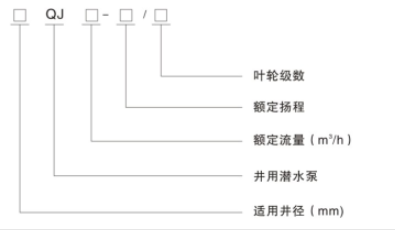 示例:75QJ1.5-11/4表示:井徑為75,流量為1.5,揚(yáng)程為11m,4葉輪的井用潛水電泵