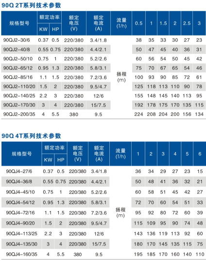75QJ、90QJ深井泵井用潛水電泵性能參數(shù):