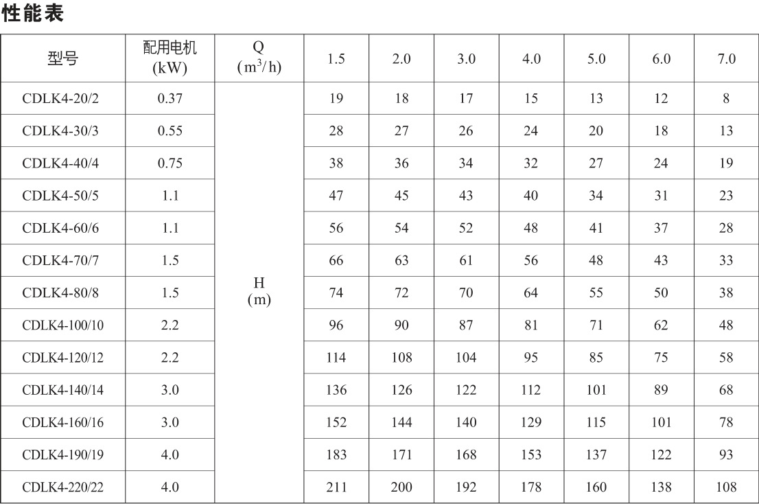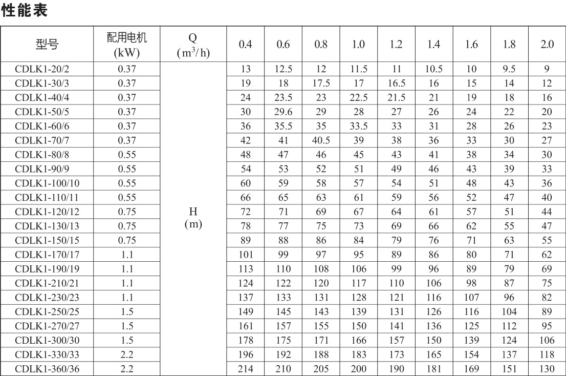 CDLK浸入式多級離心泵性能參數(shù):