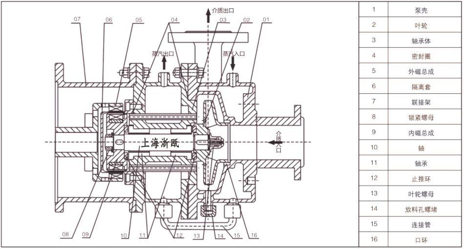 夾套保溫磁力泵磁材采用強(qiáng)磁耐高溫材料,確保足夠的磁傳力矩;隔離套設(shè)計(jì)成不等截面結(jié)枃,較等截面筒型隔離套的渦流損失減少1/2;采用獨(dú)特設(shè)計(jì)的新型保溫箱結(jié)構(gòu),保證了介質(zhì)在輸送過(guò)程中不會(huì)冷凝,同時(shí)溫度過(guò)高時(shí),保溫箱中可通入冷卻水,帶走過(guò)多的熱量,可以有效的保證電機(jī)和磁鋼的正常運(yùn)轉(zhuǎn);采用流體動(dòng)力潤(rùn)滑軸承,比原有磁力泵的同心圓式軸承運(yùn)轉(zhuǎn)更可靠,壽命更長(zhǎng);采用新型的保溫結(jié)構(gòu),確保介質(zhì)在運(yùn)轉(zhuǎn)過(guò)程中不會(huì)結(jié)晶;可以根據(jù)用戶要求配備斷流自動(dòng)停車裝置,以避免泵的干運(yùn)轉(zhuǎn)。由于夾套保溫磁力泵采用了以上的新技術(shù),使該泵在輸送高溫介質(zhì)時(shí)具有更高的可靠性和更長(zhǎng)的使用壽命。
