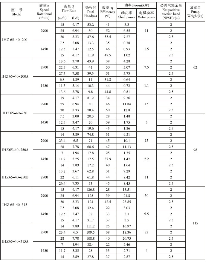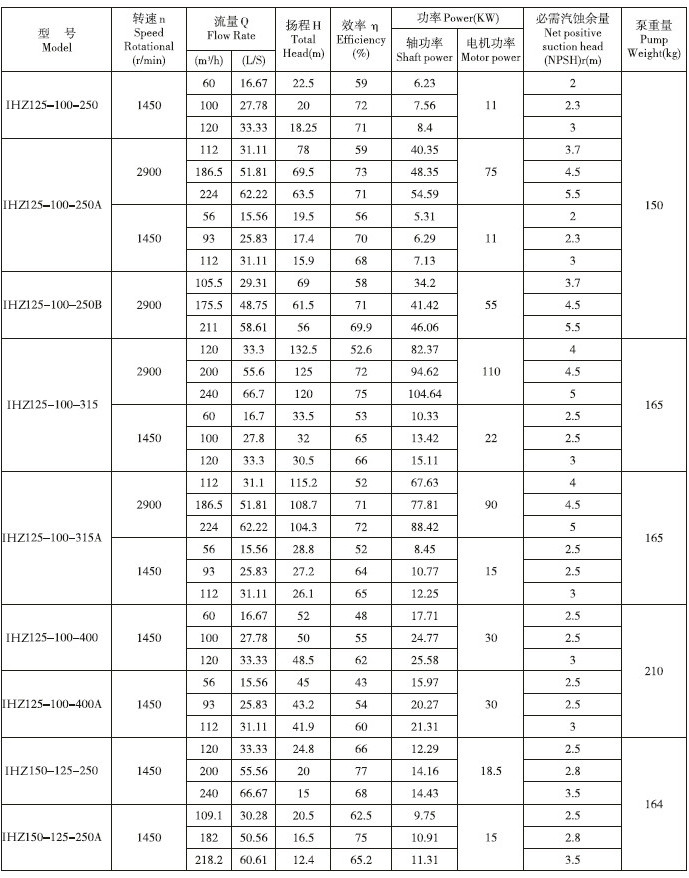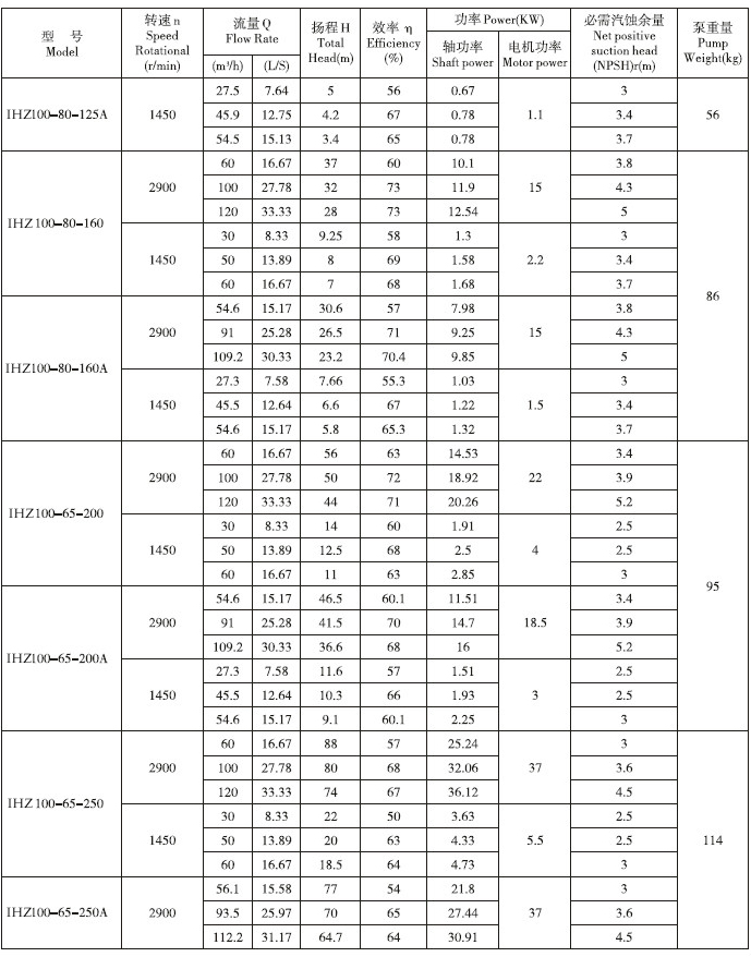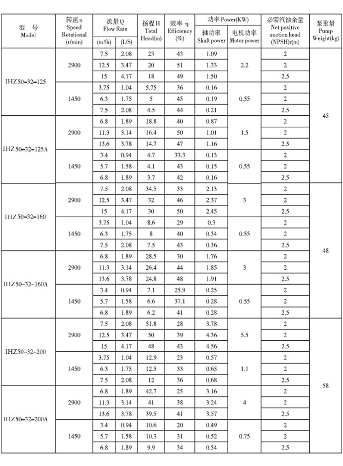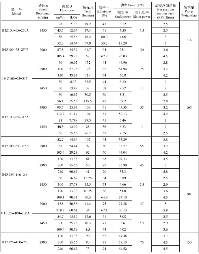 IHZ直聯(lián)化工離心泵性能參數(shù):