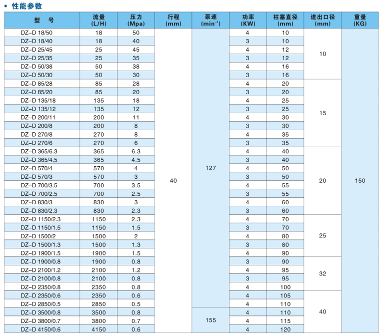 DZ-D系列柱塞式計(jì)量泵性能參數(shù):