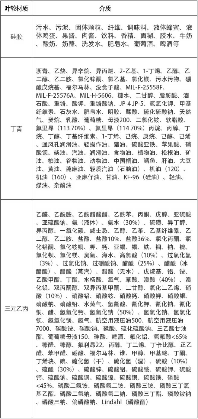 不同材質(zhì)葉輪使用介質(zhì):
