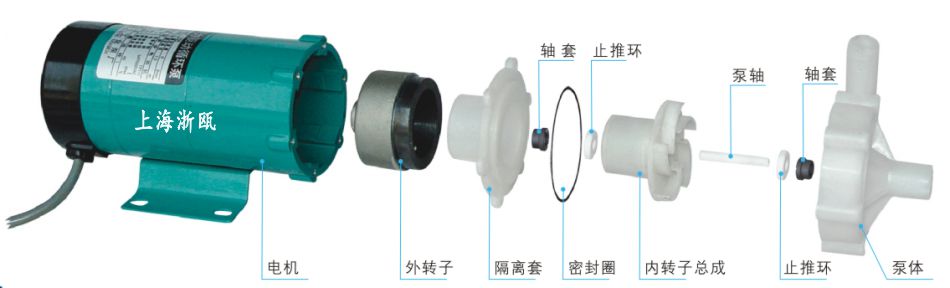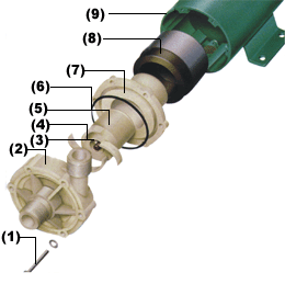 部 件 1、固定螺絲及墊圈 2、泵殼 3、泵軸 4、葉輪 5、被動(dòng)磁鐵 6、密封圈 7、隔離套 8、主動(dòng)磁鐵 9、電機(jī) |