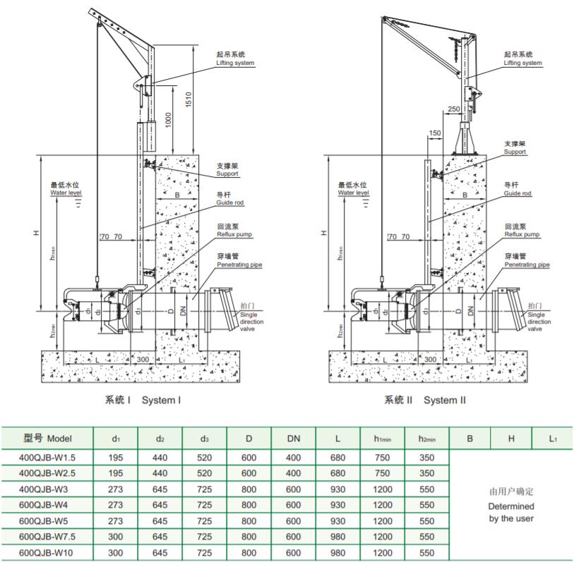 3、預(yù)埋件和拍門由用戶自行采購安裝,回流泵有水平安裝和垂直安裝兩種方式供用戶選擇。