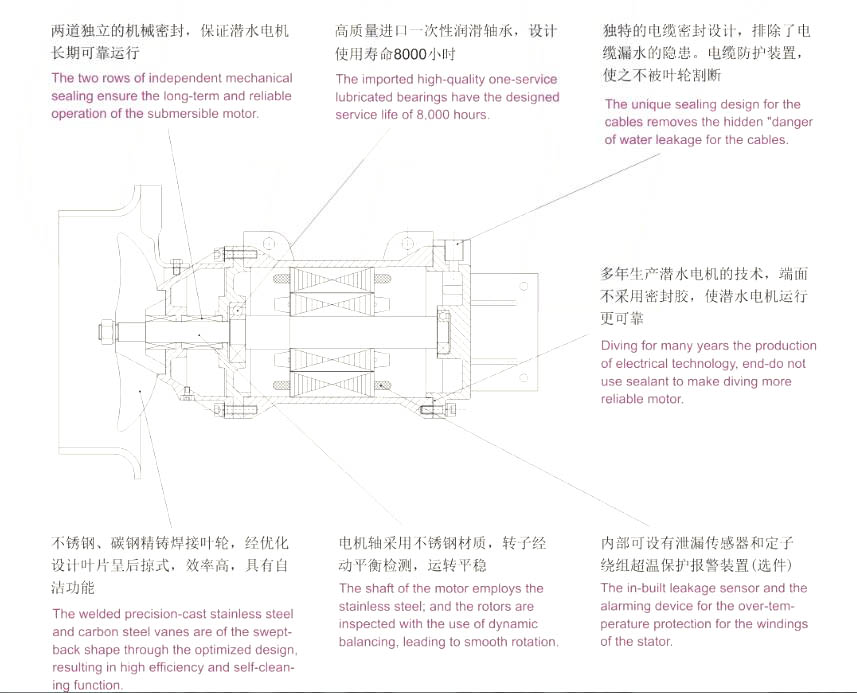 2、電機(jī)繞組絕緣等級(jí):F級(jí),防護(hù)等級(jí):IP68,電機(jī)工作制式:24小時(shí)連續(xù)工作。