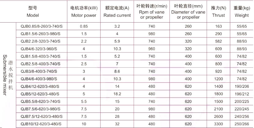 QJB型潛水?dāng)嚢铏C(jī)性能參數(shù)及安裝尺寸: