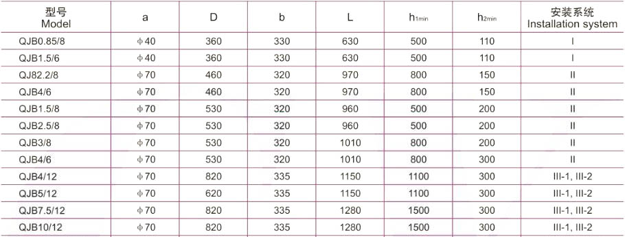 2、安裝系統(tǒng)Ⅰ— 1只適用于池深<4m,機(jī)型為QJB0.85/8 和QJB1.5/6,且可在水平方向和垂直方向調(diào)節(jié)角度; 當(dāng)池深>4m時(shí),應(yīng)選用安裝系統(tǒng)Ⅰ— 2型;