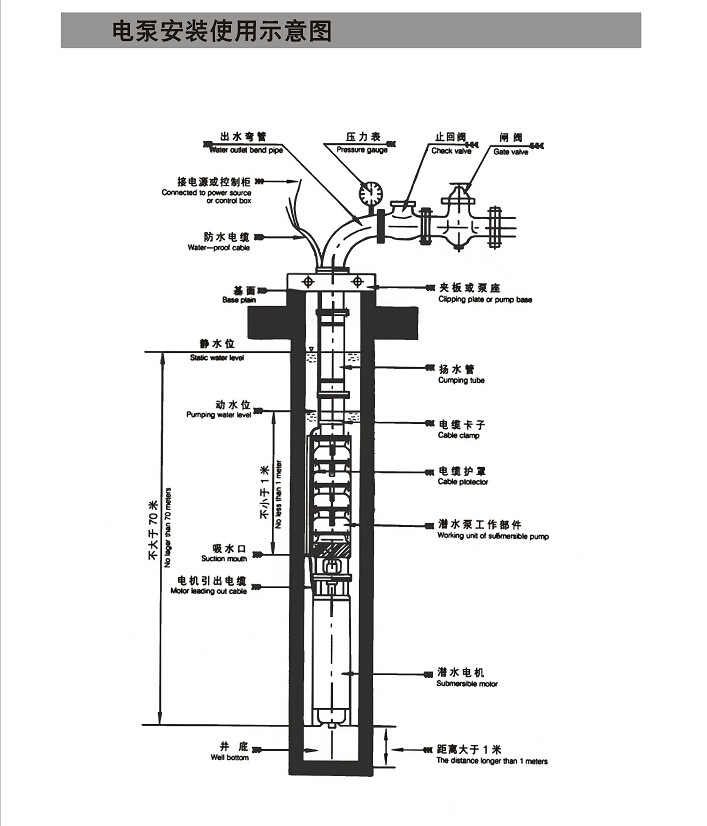 5、水泵進水口必須在動水位1m以下,但潛水深度不超過靜水位以70m,電泵下端距井底水深最少1m。