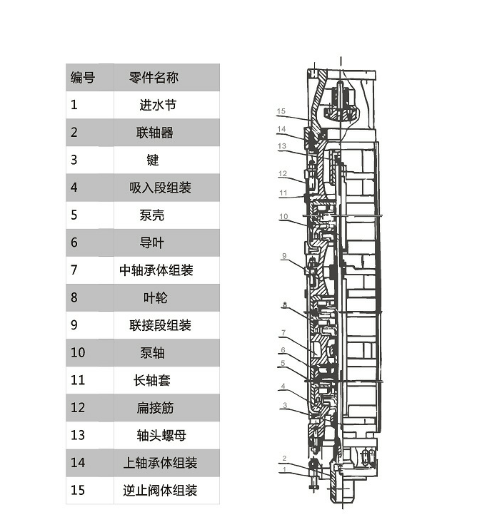 2、潛水泵為單吸多級立式離心泵;潛水電機為充水濕式、立式井用潛水異步電動機。電機與水泵通過筒式聯(lián)軸器直聯(lián)。