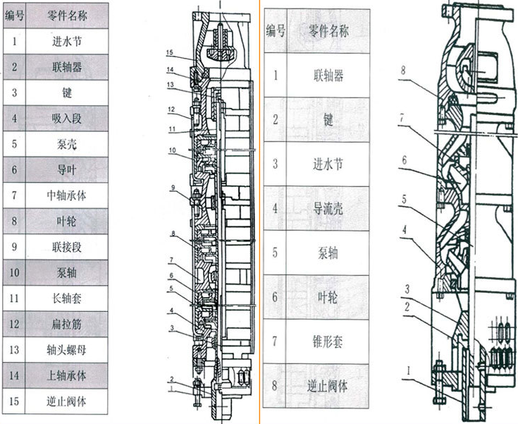 QJ型潛水泵由多級離心式葉輪分段串聯(lián)組成。泵級間由扁拉筋或螺栓連接,每段之間由橡膠(或銅)軸承支撐,泵的頂端沒有逆止閥。YQS型潛水電機為密閉充水式三相異步電機,繞組采用耐水連續(xù)密封結構,導軸承和推力軸承均為水潤滑軸承;電機上部安裝有防砂機構,阻止泥沙進入電機內控。