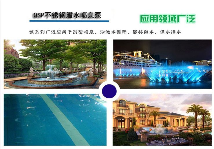 QSP不銹鋼潛水噴泉泵主要用于噴泉供水,水產(chǎn)養(yǎng)殖等場所,廣泛用于低揚程的城市、農(nóng)田排灌、噴灌,工業(yè)及民用的供、排水系統(tǒng),丘陵、山區(qū)引水,以及低洼地排除積水。