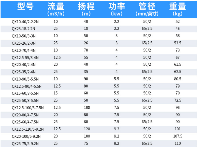 QX內(nèi)裝式潛水電泵性能參數(shù):