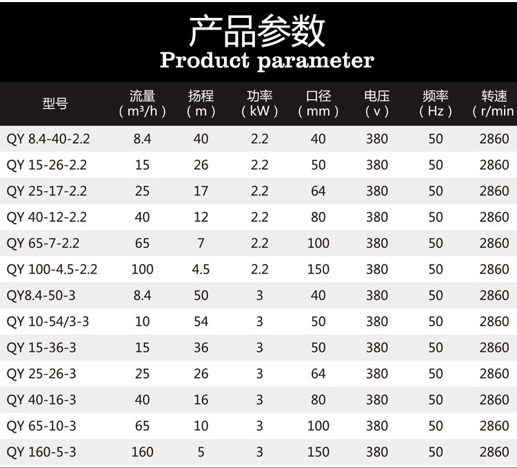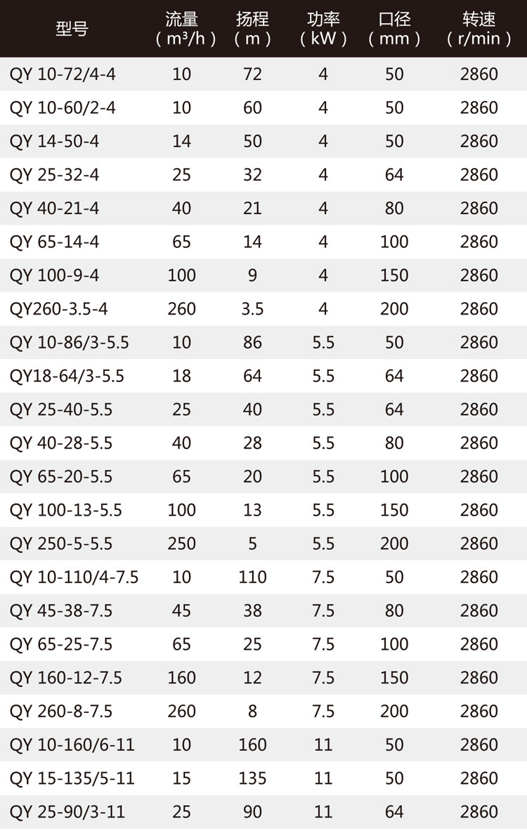 QY油浸式潛水電泵,充油式潛水泵性能參數(shù):