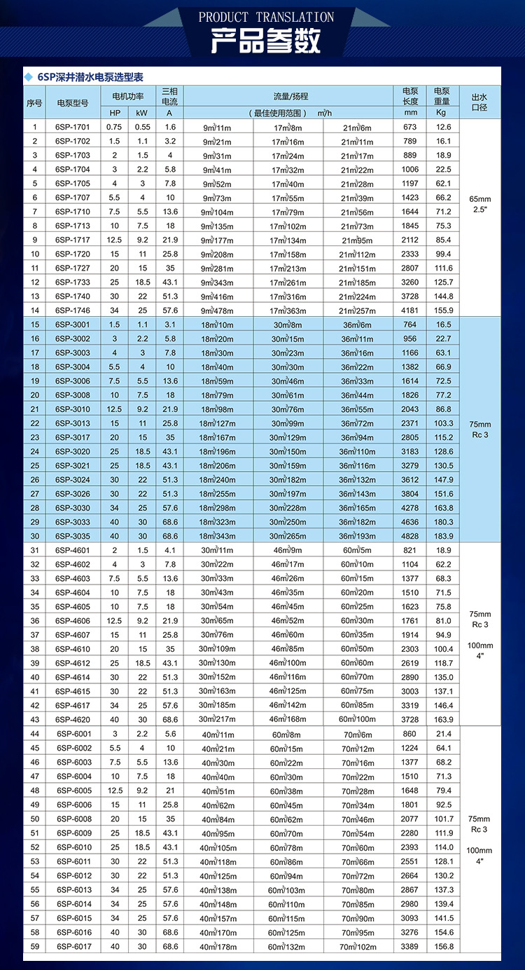 SP不銹鋼多級深井潛水電泵性能參數(shù):