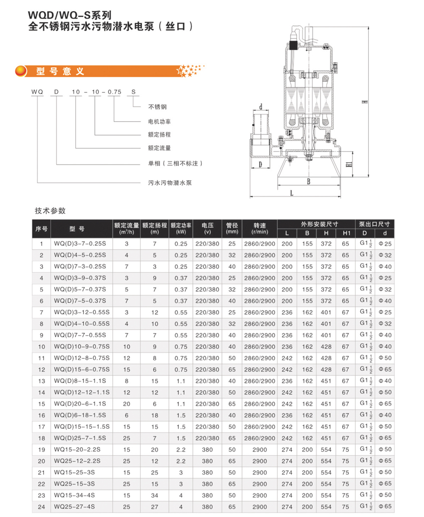 WQ-S小型不銹鋼潛水排污泵(單相/三相)性能參數(shù):
