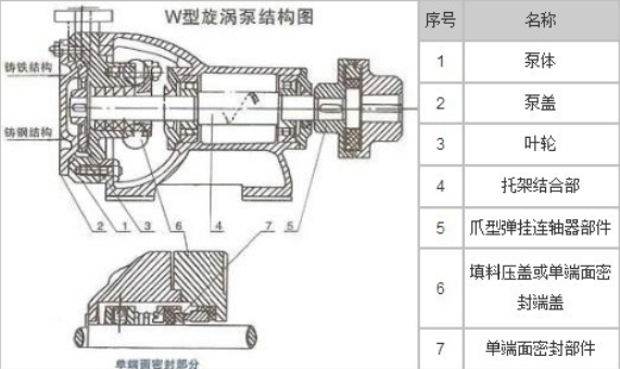 W型旋咼泵的主要零件風(fēng)型結(jié)構(gòu)〕有1、泵體2、泵蓋3、葉輪4、托架結(jié)合部5、爪型單性聯(lián)軸器6、填料壓蓋或者甲.端面密封端蓋