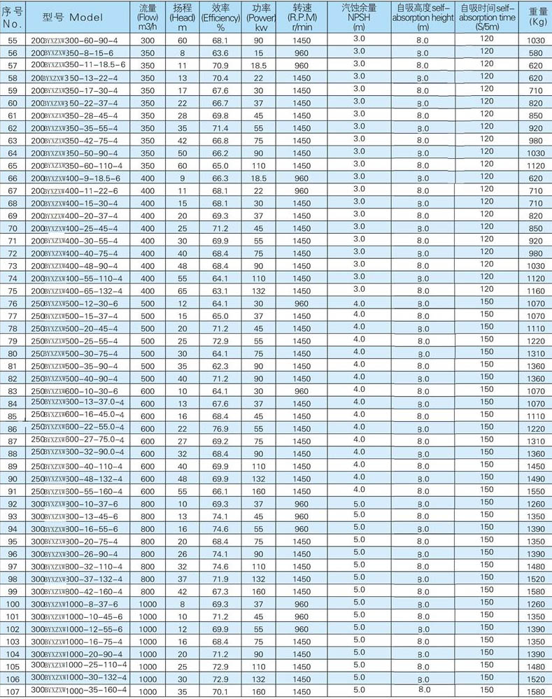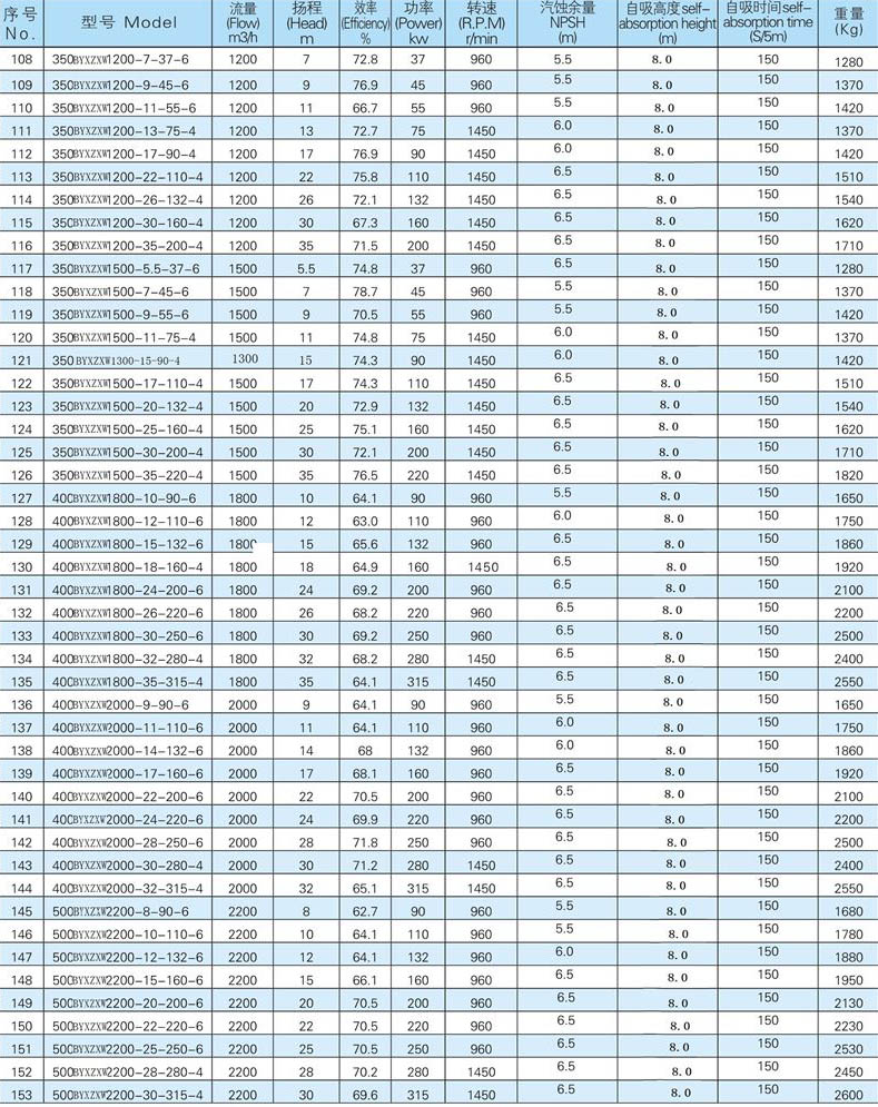 XZW系列大流量自吸泵是根據(jù)市場(chǎng)需求而開發(fā)的一種全新結(jié)構(gòu)的節(jié)能自吸泵產(chǎn)品。該大流量強(qiáng)自吸泵徹底解決了單吸式自吸泵的軸向拉力大、自吸時(shí)間長(zhǎng)、效率低等問題,具有吸程高、自吸時(shí)間短、使用效率高、節(jié)能效果顯著、運(yùn)行平穩(wěn),使用壽命長(zhǎng)等優(yōu)點(diǎn)。XZX清水型大流量自吸泵適用于輸送清水或輕度污水的場(chǎng)合,效率比污水型高,自吸性能好。XZXW大流量自吸排污泵集自吸和無堵塞排污于一體,采用軸向回流外混式,并通過泵體、葉輪流道的獨(dú)特設(shè)計(jì),既不需要安裝底閥和灌引水,又可吸排含有顆粒固體和纖維等雜質(zhì)的液體,可廣泛適用于市政排污工程、荷塘養(yǎng)殖、輕工、造紙、食品、化工、電業(yè)、纖維、漿料和混合懸浮等化工介質(zhì)理想的雜質(zhì)泵。XZC型柴油機(jī)式強(qiáng)自吸泵適用于各種復(fù)雜的應(yīng)急搶險(xiǎn)、消防等場(chǎng)合,不受電源、使用場(chǎng)地等因素的影響,可以移動(dòng)作業(yè),靈活性高。