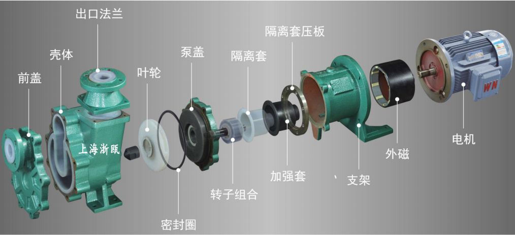 ZMD氟塑料自吸式磁力泵為推出的新一代耐腐蝕自吸磁力泵,它不但集氟塑料磁力泵的優(yōu)點于一身,而且大的功能是可以自吸、無泄漏,這是以往的所有氟塑料磁力泵不能達到的,因此,該系列泵一推出就受到了廣大用戶的歡迎。該系列泵可廣泛適用于化工、有色金屬冶煉、制酸制堿、造紙、酸洗工藝、稀土分離、電鍍、電子、化成箔、卸酸堿等行業(yè)或工作流程,是目前磁力泵品種中結(jié)構(gòu)新穎的產(chǎn)品之一,且高效節(jié)能、安全實用。 該泵的適用溫度:-20°C-100°C。ZMD氟塑料磁力泵采用電機直聯(lián)式結(jié)構(gòu),由中間支架支撐,結(jié)構(gòu)緊湊,拆卸維護方便,采用高性能磁性材料“釹鐵硼”制造內(nèi)外磁體,隔離套采用進口非金屬材料, 消除了一般磁力泵具有的磁渦流損耗,可輸送高濃度,密度大于1.84t/m3的強腐蝕介質(zhì);主要部件采用鋼襯F46,泵體強度高,能耐所有強酸,強堿的腐蝕; 產(chǎn)品充分結(jié)合了磁力泵與自吸泵的優(yōu)點,是在IMD磁力泵的基礎(chǔ)上延伸開發(fā)出來的產(chǎn)品,突出的特點是既具有自吸泵的自吸功能又有磁力泵的無泄漏、運轉(zhuǎn)寧靜的優(yōu)點,是液下泵好的替代產(chǎn)品。特別適合于輸送易燃、易爆、有毒、有揮發(fā)性及貴重介質(zhì)?,F(xiàn)已批量投放市場,在很多項目上替代了進口磁力泵。ZMD氟塑料磁力泵廣泛適用于石油化工、有色金屬冶煉、制酸制堿、造紙、酸洗工藝、稀土分離、電鍍、電子,化成箔等行業(yè)吸取輸送低于泵安裝位置以下的腐蝕性液體,是目前磁力泵品種中結(jié)構(gòu)新穎的產(chǎn)品,高效節(jié)能、安全實用。